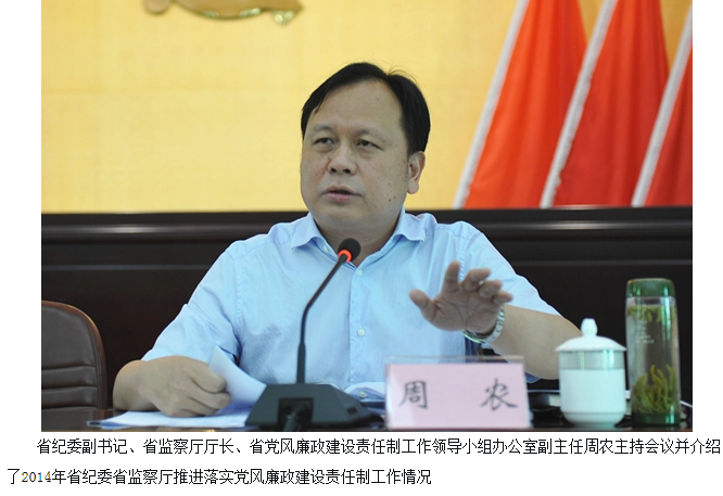 5月7日,湖南省召开党风廉政建设责任制工作领导小组办公室成员单位负责人会议,对全面落实党风廉政建设责任制进行部署。省委常委、省纪委书记、省党风廉政建设责任制工作领导小组副组长黄建国出席会议并讲话。省纪委副书记、省监察厅厅长、省党风廉政建设责任制工作领导小组办公室副主任周农主持会议并介绍了2014年省纪委省监察厅推进落实党风廉政建设责任制工作情况。省委办公厅、省政府办公厅等18个省党风廉政建设责任制工作领导小组办公室成员单位主要负责人就本单位本部门本系统如何落实2015年党风廉政建设责任制任务分工进行了发言。
