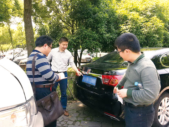 图为5月2日浙江省杭州市纪委检查组工作人员在西溪湿地景区停车场检查公车私用情况。 记者 杨诗琪 摄