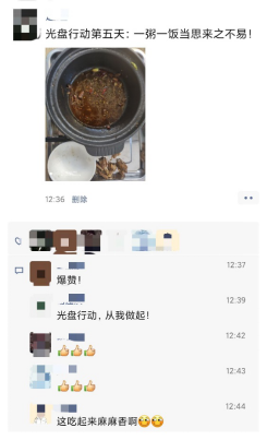 朋友圈是人们生活方式的见证,是每个人的“第二张脸”,湖南城市学院某些班级利用网络管理优势,开展“晒光盘”线上打卡活动,让学生们在网络上互相监督,使同学们自觉养成光盘习惯,争做“光盘侠”。开展打卡活动的1903307班班长刘星说到“一粥一饭,思来之不易;半丝半缕,恒念物力维艰。开展本次活动旨在积极传递‘勤俭节约,文明用餐’新风尚。”