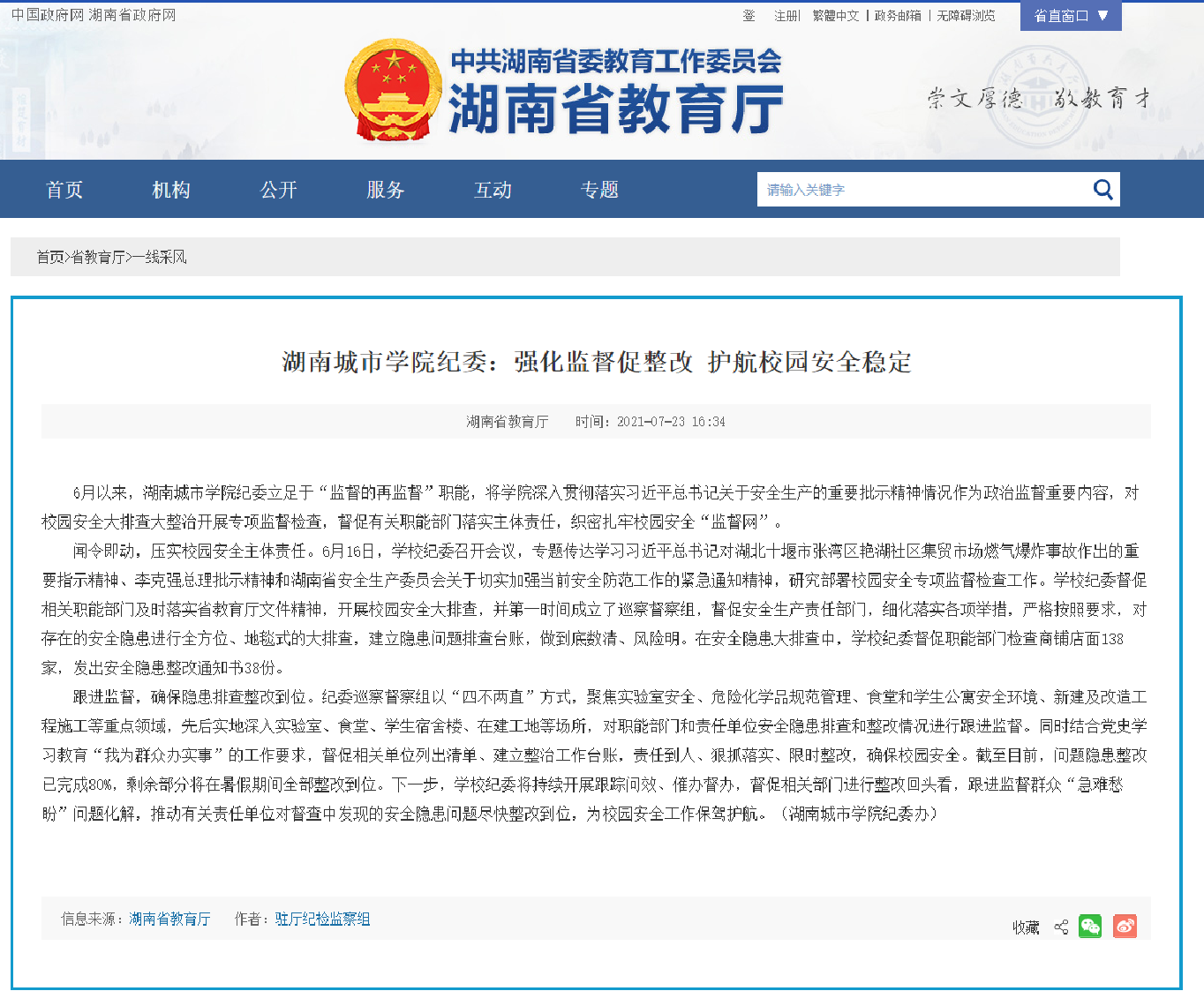 6月以来,湖南城市学院纪委立足于“监督的再监督”职能,将学院深入贯彻落实习近平总书记关于安全生产的重要批示精神情况作为政治监督重要内容,对校园安全大排查大整治开展专项365英国上市公司在线,督促有关职能部门落实主体责任,织密扎牢校园安全“监督网”。