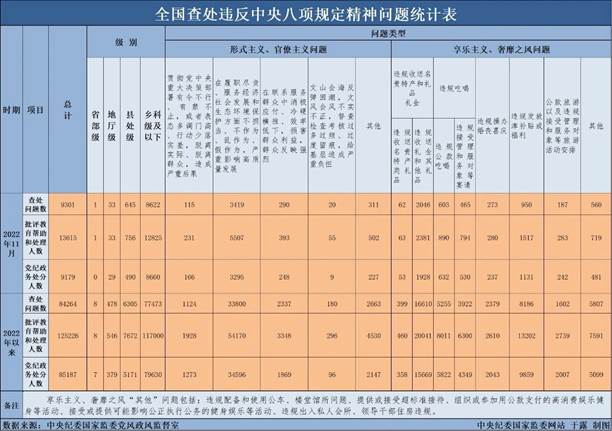 本网讯 12月27日,中央纪委国家监委公布了2022年11月全国查处违反中央八项规定精神问题汇总情况。今年11月,全国共查处违反中央八项规定精神问题9301起,批评教育帮助和处理13615人,其中,党纪政务处分9179人,这是连续第111个月公布月报数据。